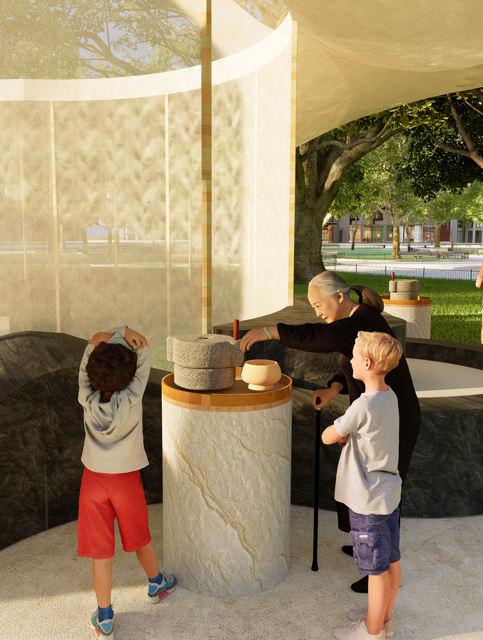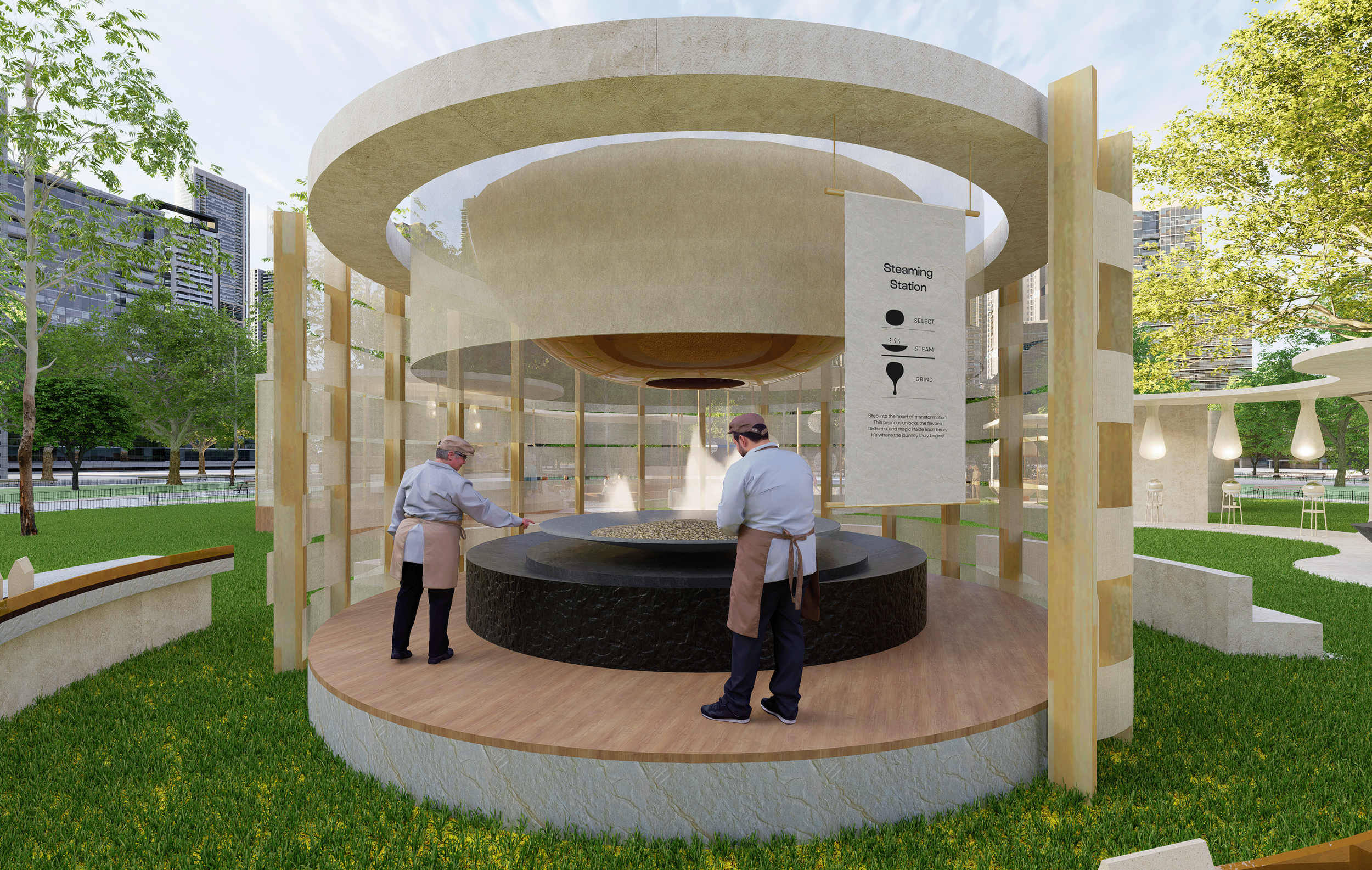 An interactive, hands-on journey from bean to cream. Visitors select their soybeans, steam them, and grind them using a traditional millstone, experiencing the full transformation process. At the final step, they label their handcrafted soybean milk with their name, echoing the familiar café tradition of calling out orders. This fusion of Korean tradition and American dining culture creates a unique and engaging experience.