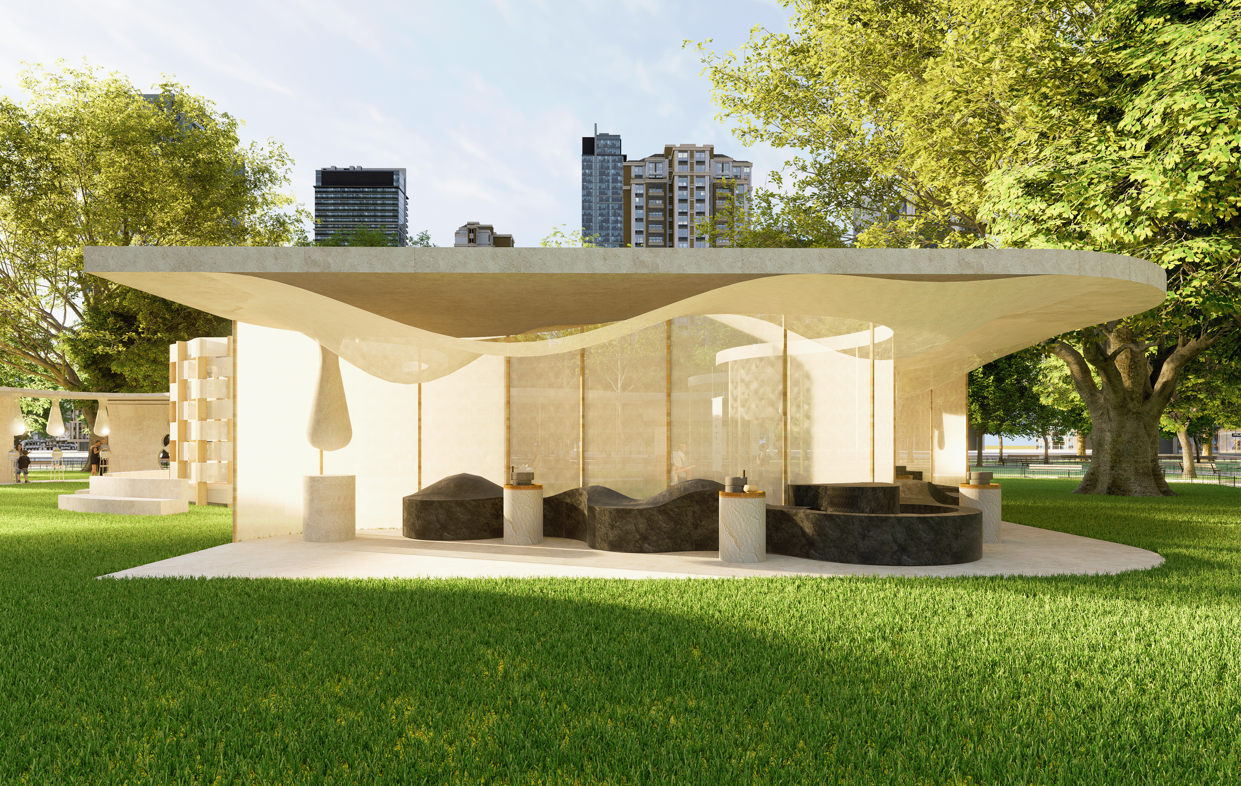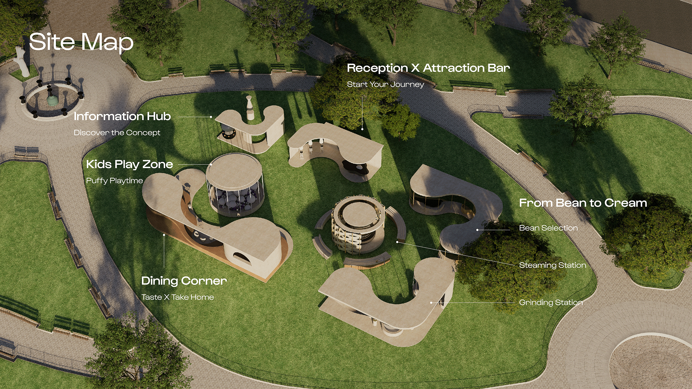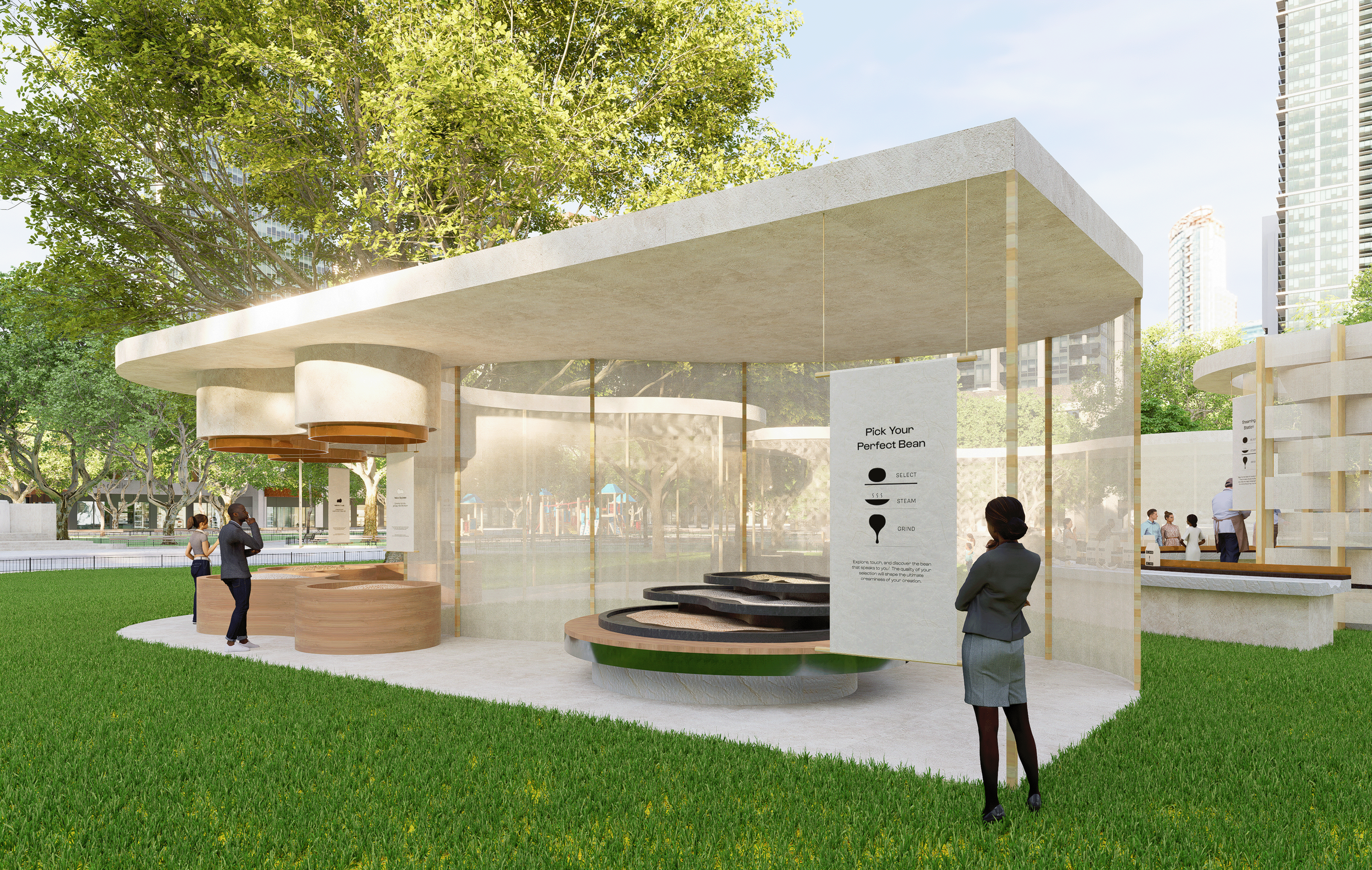 A soft, organic space inspired by the transformation of beans into cream. Fluid forms, bean-shaped elements, and translucent layers create an airy, immersive experience.