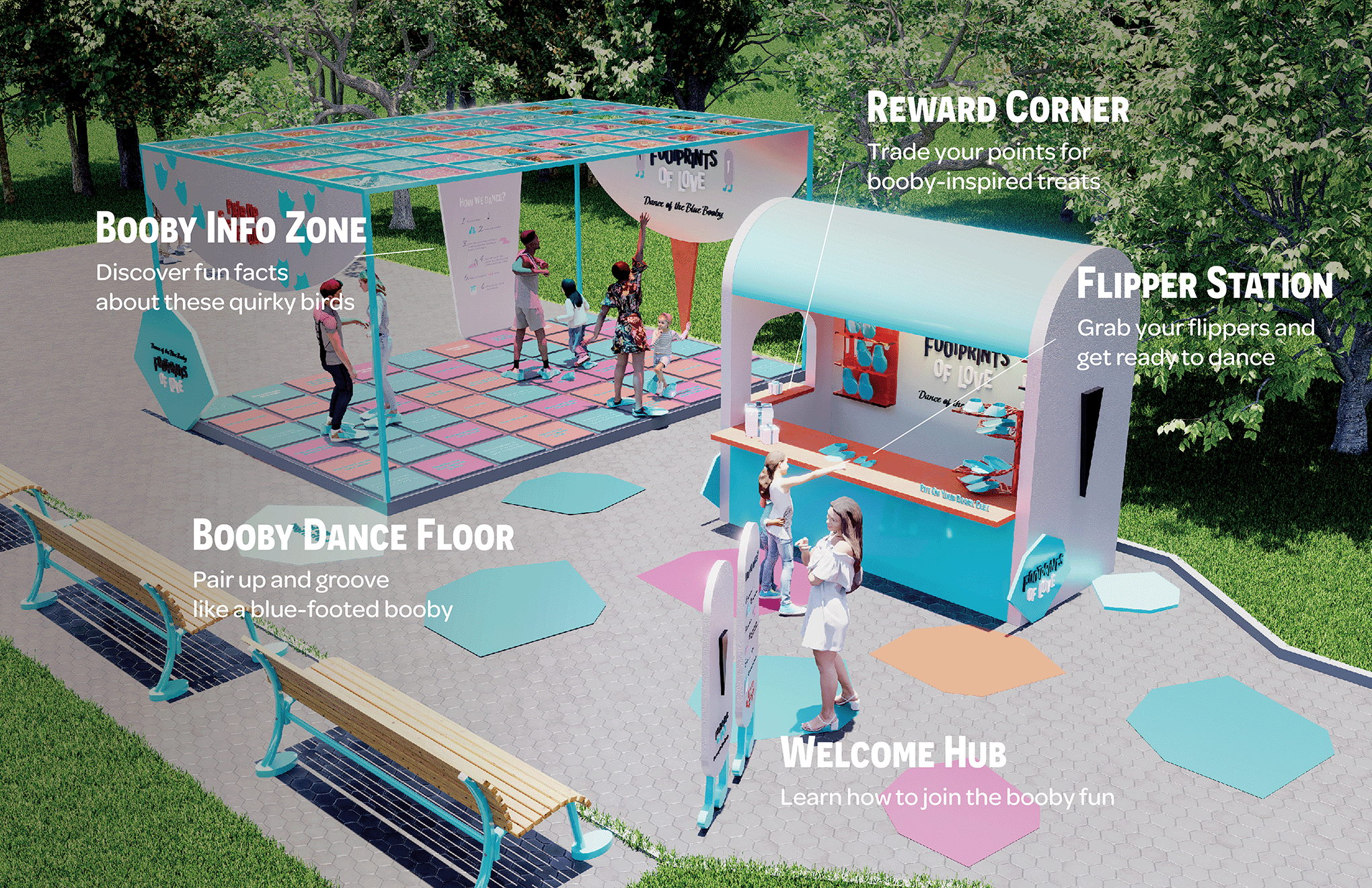 The blue-footed booby is not just a fascinating bird—it’s also facing a decline in population. To highlight their importance and conservation needs, this pop-up exhibition was created to engage visitors in a fun yet meaningful way.