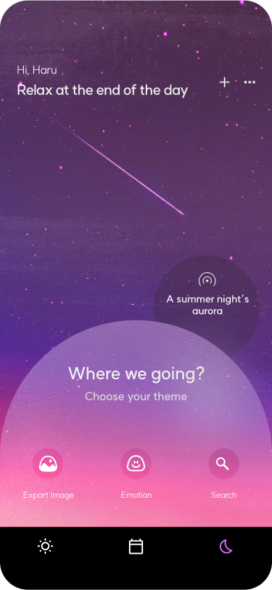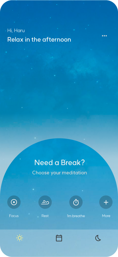 At work, “Huha Office” offers a mobile meditation experience inspired by jellyfish motifs, guiding users to stabilize their breath through calming graphic interactions. By syncing with these visuals, users can naturally find steady breathing, helping to restore inner tranquility and mental peace amidst the demands of daily life.